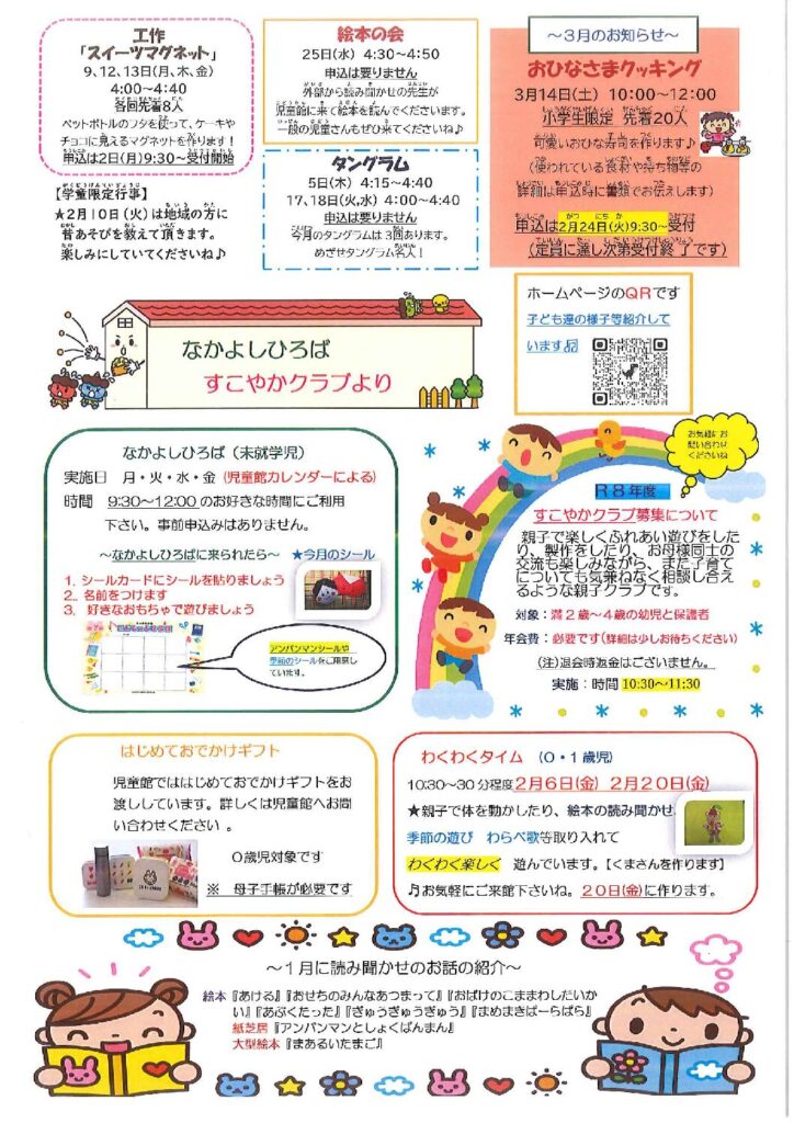 | 内容 | ・公園のような雰囲気の中で、親子が気軽に集い、 自由に遊び、交流できる場として実施 ・わくわくタイム、0歳児・1歳児タイムを実施 月1~2回程度の金曜日(10:30〜11:00) |
