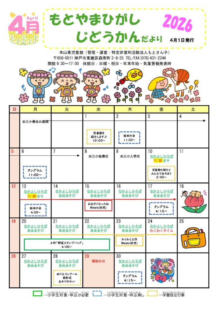 | 実施日 | 4月〜翌年3月(小学校休業期間はお休み)週4回 月曜日、火曜日、水曜日、金曜日(9:30~12:00) |